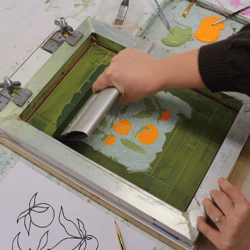 Printing the design Push ink through the screen to transfer the image onto the fabric.